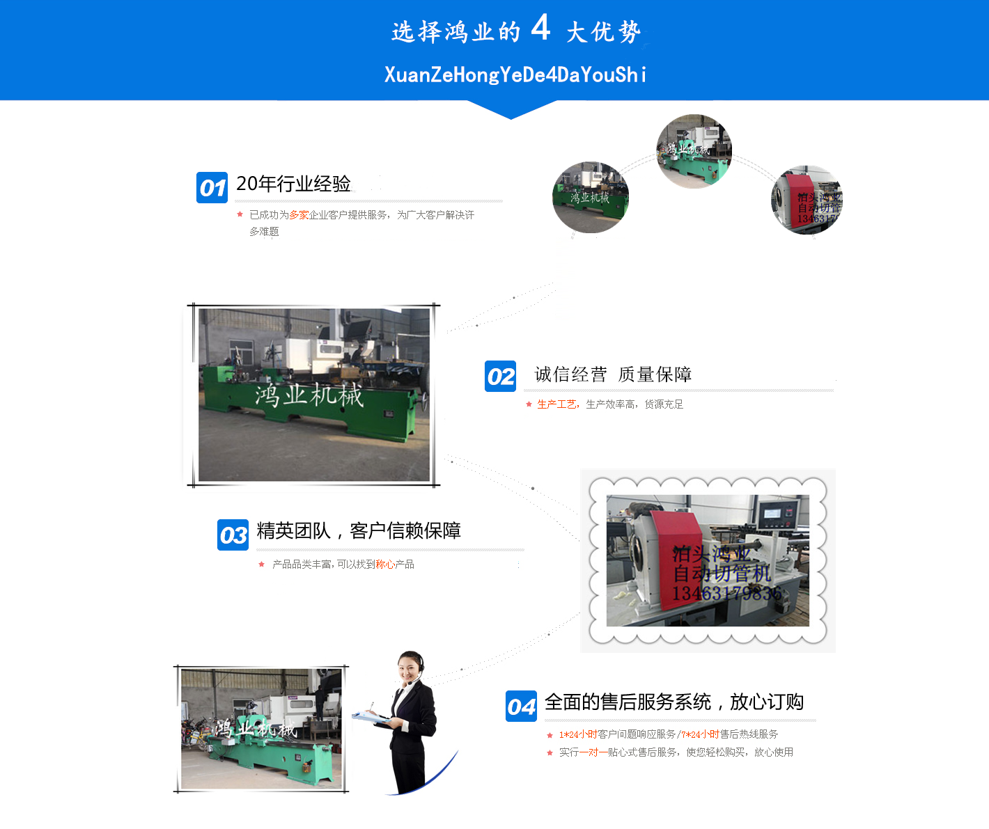 泊頭市鴻業(yè)機(jī)械金屬加工廠主要產(chǎn)品包括托輥雙端自動(dòng)焊接機(jī)床,托輥雙端自動(dòng)壓裝機(jī)床,鋼管自動(dòng)倒角切斷機(jī)床,托輥鋼管雙端自動(dòng)車孔機(jī)床,托輥鋼管雙頭車孔機(jī)床,托輥雙頭車,加工托輥專用設(shè)備.根據(jù)用戶對工件加工、焊接的不同工藝及工序要求,設(shè)計(jì)專用機(jī)床是公司的 點(diǎn).本公司融合國內(nèi)外生產(chǎn)技術(shù),為廣大用戶提供科學(xué)性能優(yōu)良,質(zhì)量 的產(chǎn)品,我們擁有高素質(zhì)的員工隊(duì)伍,隨時(shí)為您提供服務(wù).